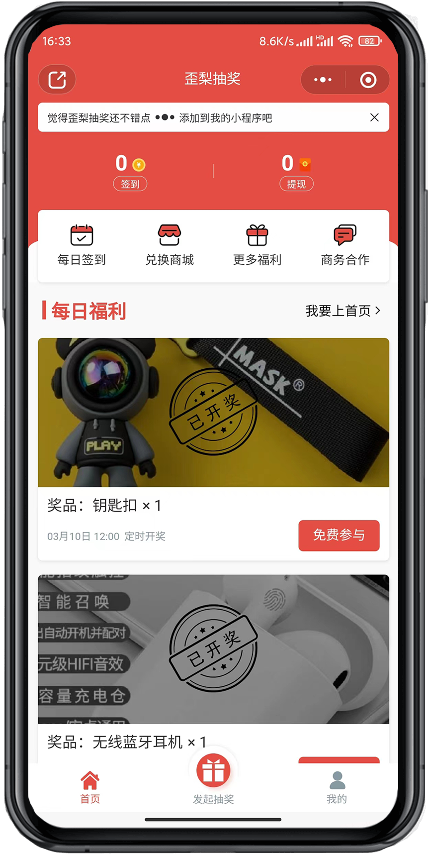 歪梨抽奖主要功能分为:免费参与抽奖、免费发起抽奖、签到/中奖收益。